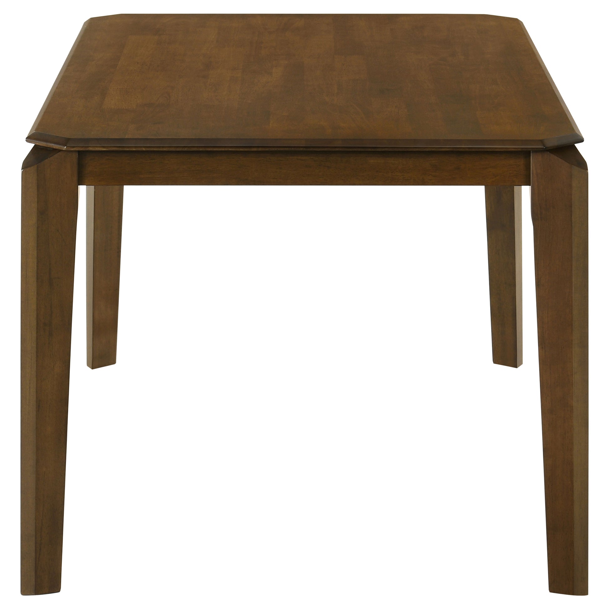 Center your stylish dining room on the angular silhouette of a modern rectangular dining table. Perfect for family gatherings and daily meals, it boasts a dark brown wood finish over rubberwood, delivering excellent style and durability. The rectangular table featured a chamfered edge that augments the flared design and almost faceted look of its four support legs. The legs protrude beyond the tabletop, while a recessed apron completes the look with familiarity. The table comfortably seats four to six, perfect for your breakfast nook or dining room.
