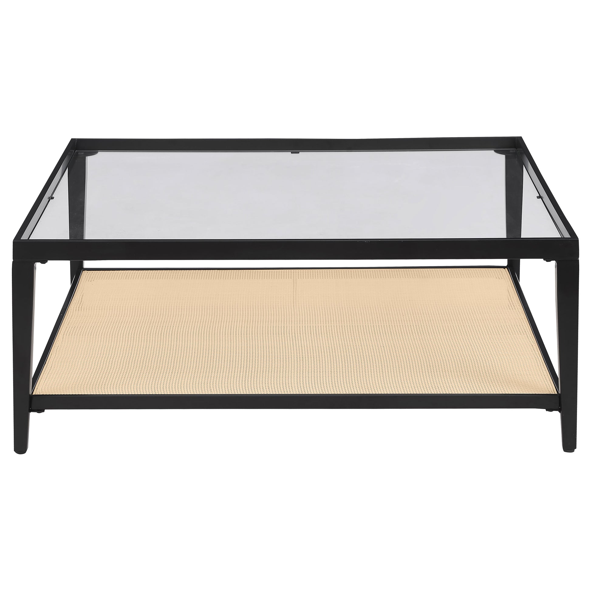 Enhance your living room with the contemporary charm of this sleek square coffee table. The black powder-coated metal frame creates a clean, modern aesthetic, while the recessed clear tempered glass top provides an elegant and spacious surface for your decor or coffee essentials. Below, a shelf crafted from radio weave polyethylene (PE) rattan adds a unique texture and convenient storage, blending natural materials with modern design. This cocktail table brings a sophisticated, functional touch to any seating area, making it the perfect centerpiece for a stylish living room. Its versatile design complements various décor styles, elevating your space with ease.