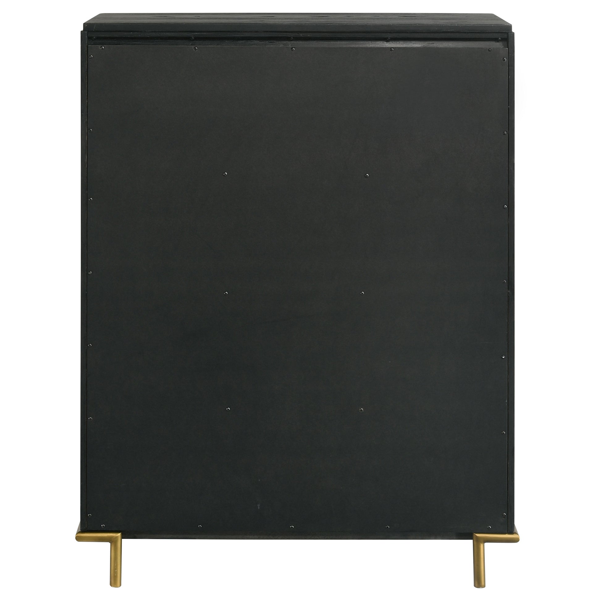 Enhance storage and style in your bedroom with a modern five-drawer chest. Impeccably designed, it features a classic silhouette complete with rounded corners that create a softened effect perfect for a soothing space. The chest offers five drawers for easy and accessible storage, and each is decorated with a pair of petite round knobs in a golden finish. A crisp black finish is wire brushed to create texture, enhancing the wood grain look of this chest. Gold finish legs match the hardware for a cohesive look and the top is perfect for decor.