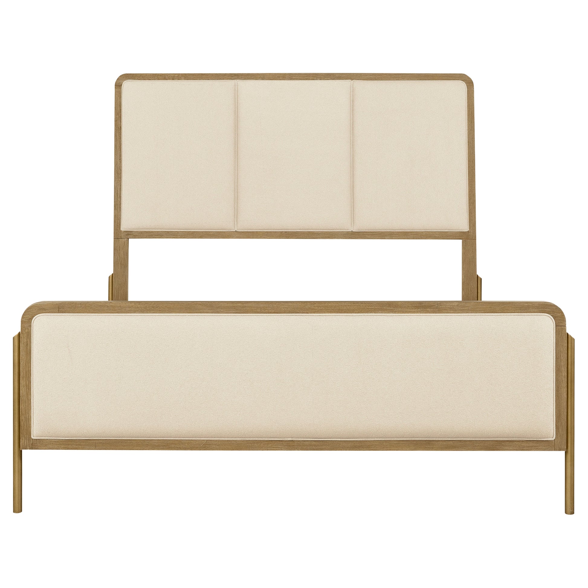 Elevate your coastal bedroom with this stunning panel bed, designed with retro-inspired elements and luxurious details. Cream fabric upholstery on the headboard and footboard is framed by a sleek black edge, creating a bold contrast and soft texture. The aged brass metal legs introduce a metallic accent that enhances its glamorous appeal. Crafted from rubberwood, plywood, engineered wood, and ash veneer, this bed combines durability and sophistication for a timeless centerpiece.
