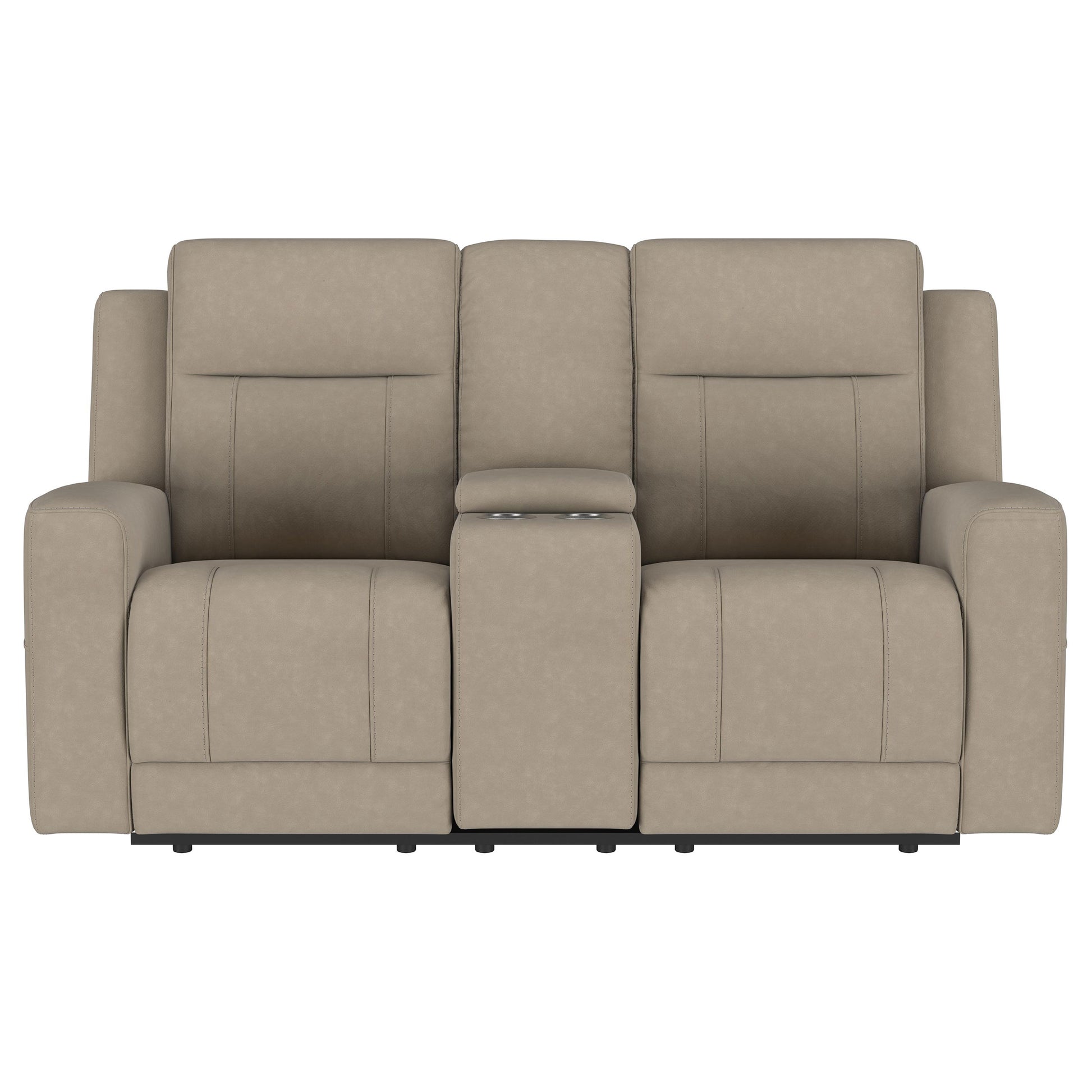 Revamp your living room or den with the inviting comfort of a modern reclining loveseat. Complete with a center console that adds storage and a pair of cupholders, this loveseat is sure to become your favorite on movie nights and game days. It features sleek track arms with modern tufted accents that create impeccable support. Suede-like upholstery has a soft, matte effect, perfect for augmenting with neutral appeal. Add a pair of throw pillows to bring a personal touch to this look.