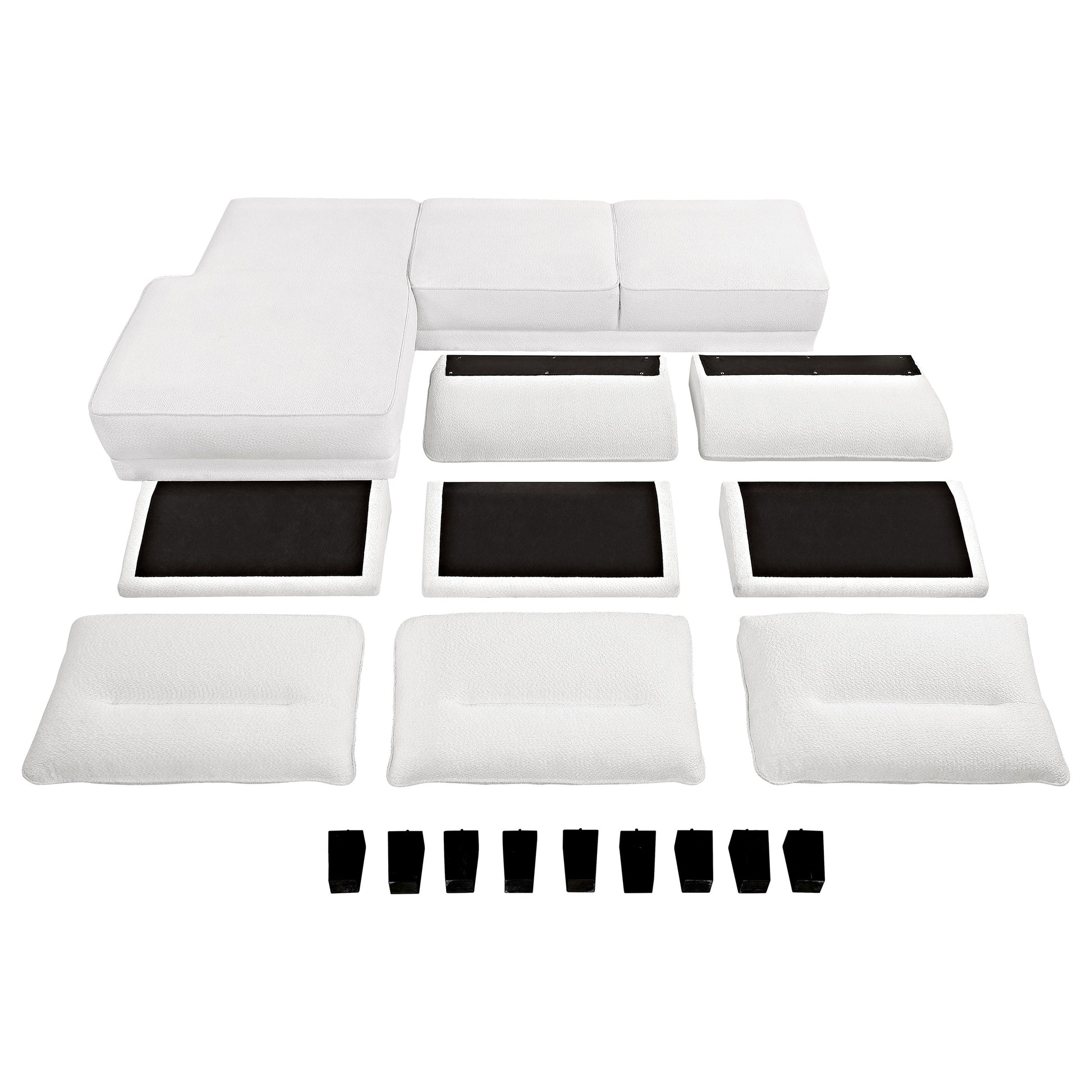 Experience ultimate comfort with this modern two-piece sofa chaise, available in grey or white. The fuzzy teddy bear-like textured fabric upholstery creates a cozy atmosphere. The softly rounded arms and welt framed reversible back cushions add a touch of sophistication. With attached welt-accented boxed seats and solid wood tapered legs, this sectional ensures a well-kept appearance and sturdy foundation.