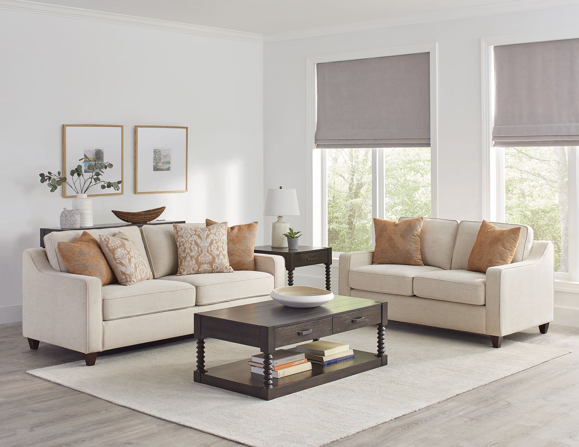 Elevate your living space with this upholstered loveseat, wrapped in soft beige chenille for a cozy yet refined look. Designed with sloped track arms and tapered dark brown wooden legs, it offers a balanced blend of comfort and sophistication. Boxed seat and back cushions with classic welt trim highlight its tailored design, while coordinating accent pillows in copper and coral hues add a subtle touch of contrast. Ideal for modern or transitional interiors, this loveseat provides timeless style and inviting comfort.