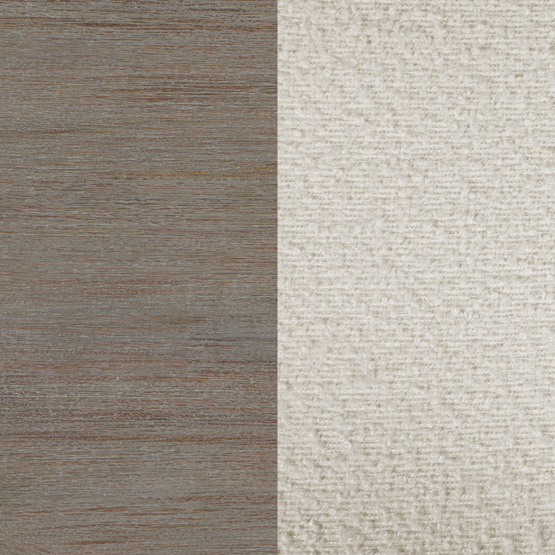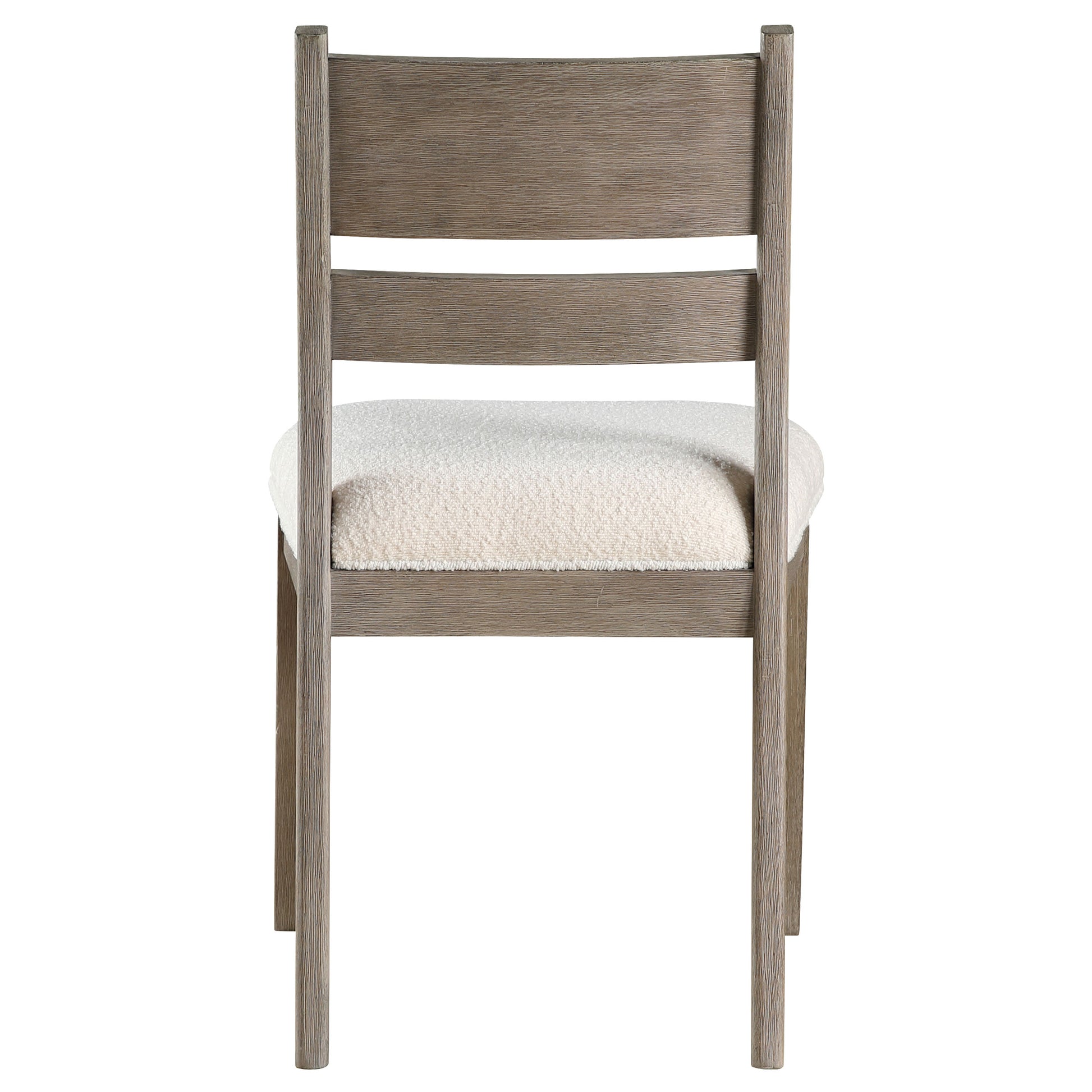 Upgrade your dining table with a set of two modern farmhouse side chairs. Perfect for a casual kitchen table, they feature coastal character with a grey wood finish that offers subtle wood grain patterning. Upholstery is a creamy white with wonderful texture that adds depth and comfort. The inviting chair design includes a gently angled back with a modified ladder back that pairs a wide top slat with a slimmer lower slat to create a compelling asymmetric silhouette. This pair is great for kitchens and dining rooms, alike.
