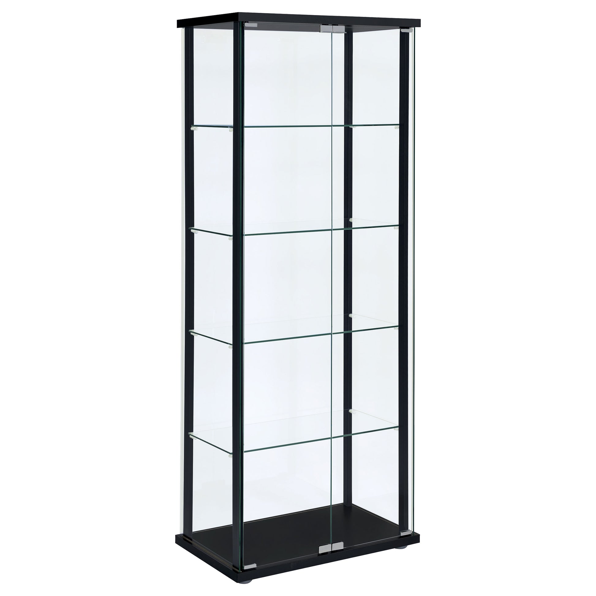 Transparency and linear styling make this curio cabinet stand out and shine. Simple design work blends straight lines with a slender black frame and tempered glass shelves. Push-to-open doors offer easy access to interior shelving. Put your best decor on display in this elegant piece that works beautifully in a living room or end wall. This enticing curio cabinet delivers a breathtaking look in modern and more traditional interiors.