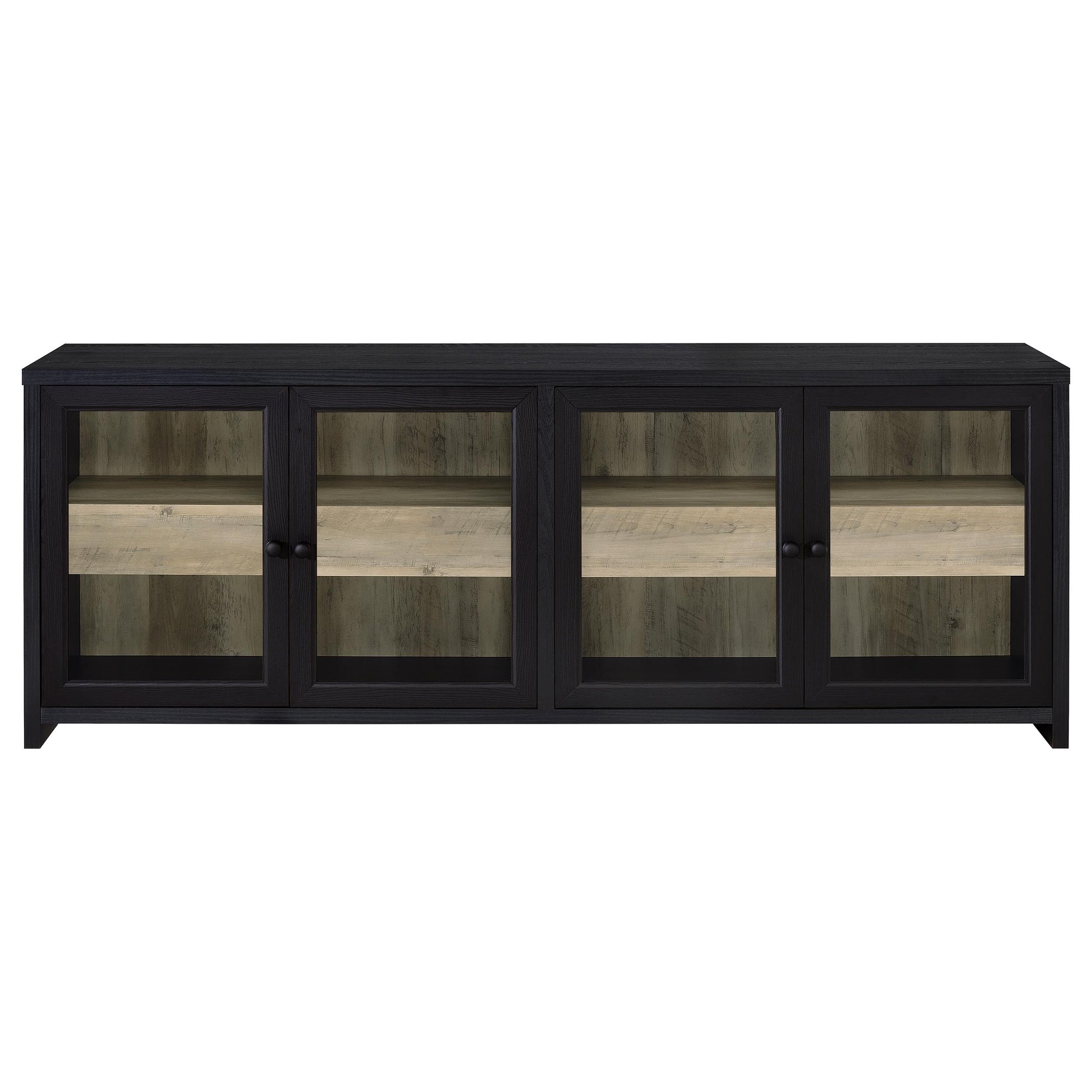 This expansive media console merges bold presence with discreet practicality. Framed in a striking black finish, four glass doors reveal warm wood-look interiors with hidden drawers behind each panel—perfect for tucking away remotes, devices, and essentials. The broad surface accommodates TVs up to 85 inches, while fixed shelving enhances display or storage flexibility. Crafted from engineered wood and clear glass with gunmetal hardware, it delivers a grounded, modern-rustic statement for any living room.
