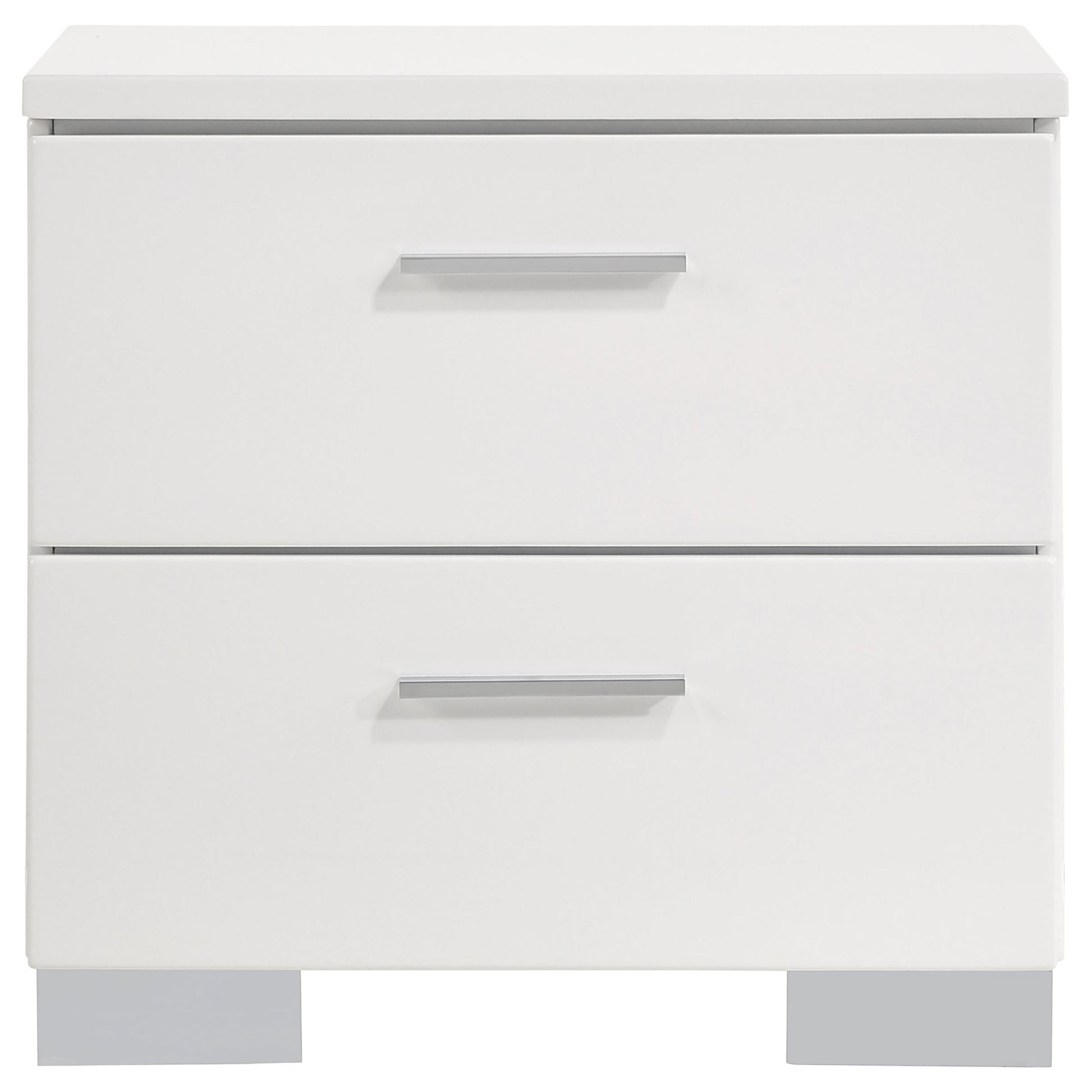 Elevate your bedroom with the sleek sophistication of this contemporary bedroom set. The panel bed features a clean-lined white high gloss headboard and a faux leather upholstered frame, delivering a refined yet modern aesthetic. Chrome-finished accents add a polished touch, while smooth-gliding drawers ensure effortless functionality. Designed for both style and durability, this set brings a fresh, minimalist feel to any space.