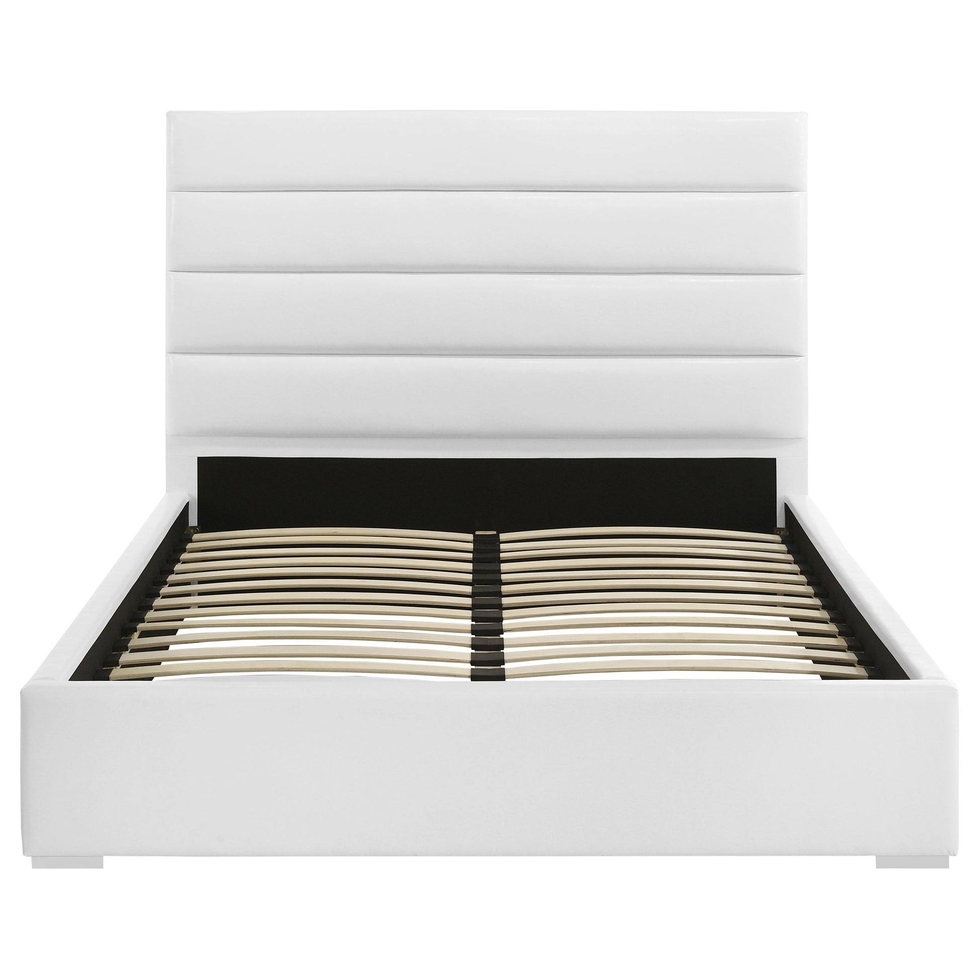 Elevate your bedroom with this modern upholstered bed featuring clean lines and a minimalist design. Wrapped in white faux leather, the panel headboard showcases horizontal channeling for a sleek and contemporary look. The sturdy frame includes slat support, eliminating the need for a box spring while ensuring mattress stability. Crafted from durable materials, this bed combines engineered wood and metal for lasting reliability. Perfect for creating a crisp, modern ambiance in any bedroom.