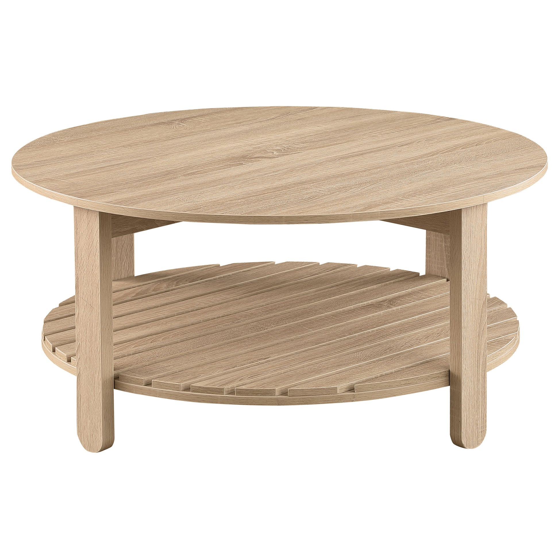 This coffee table set combines modern farmhouse style with functional design, creating a cohesive look for any living room. Each piece is crafted from durable engineered wood with an eco-friendly, scratch-resistant laminate veneer and features a natural finish with soft wood grain detailing. The round tabletops provide ample surface space, while the slatted lower shelves add texture and storage options. Designed for everyday use, this set is a practical and stylish choice for any home.
