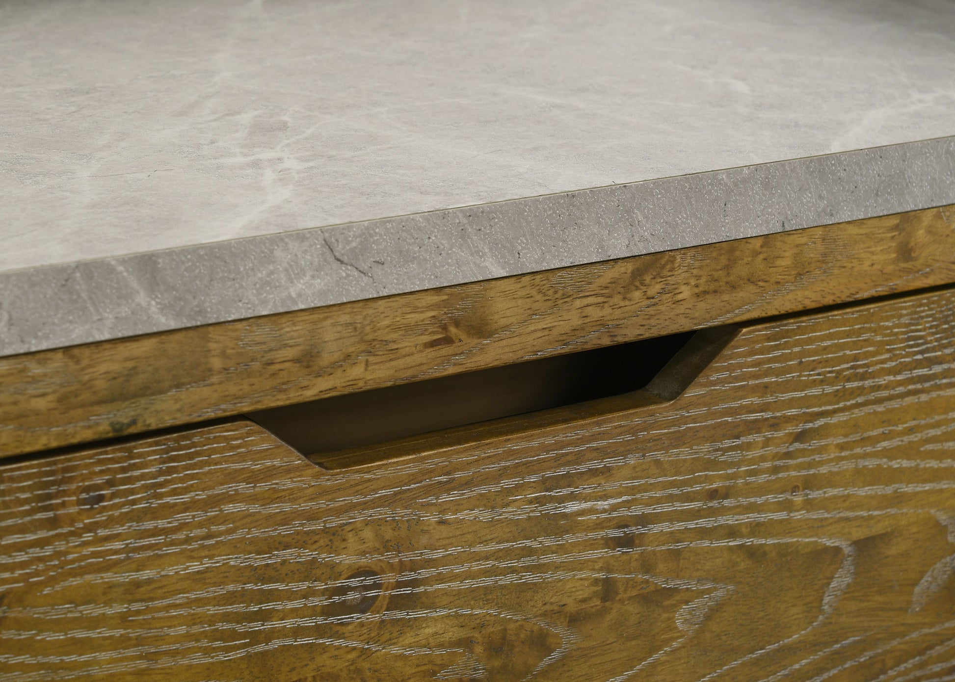 Bringing together the warmth of rustic woodgrain and the sleekness of modern design, this bedroom set offers a harmonious blend of style and function. Crafted from solid rubberwood with embossed oak grain in a weathered medium oak finish, each piece features thoughtful touches, from faux marble tops to led lighting and built-in USB charging. Upholstered accents and open shelving enhance both comfort and convenience, making this set a natural centerpiece for contemporary living.