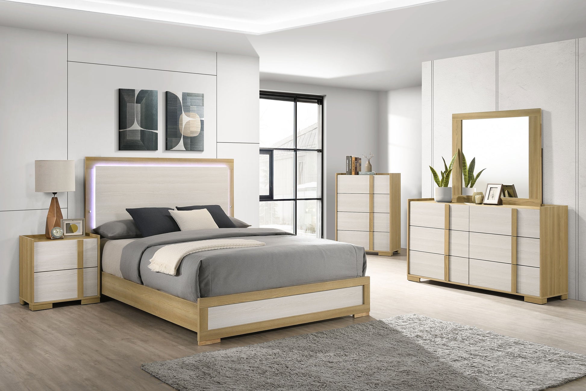 • Harmoniously blends natural wood tones with crisp white panels for a modern, cohesive look