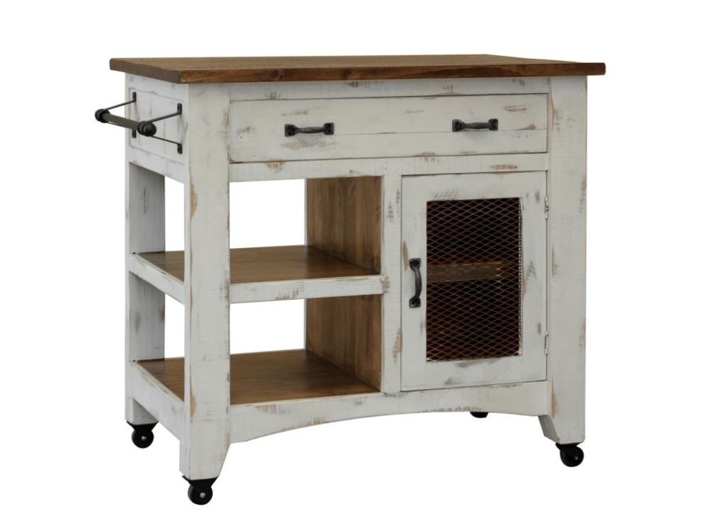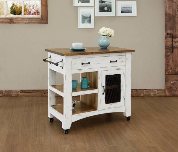 - Non-chip, custom pulls and hand-wrought base add durability.