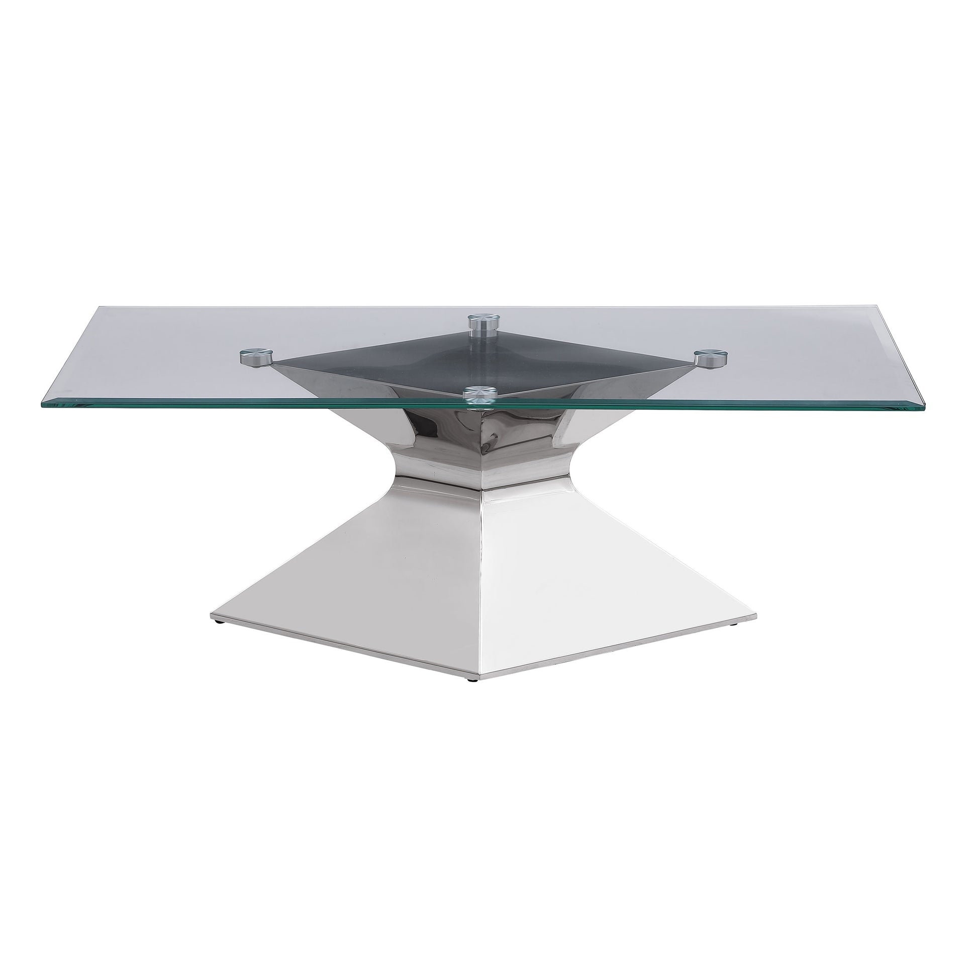 Go bold with this modern coffee table, featuring a polished silver hourglass-inspired pedestal base. Constructed with stainless steel and tempered glass, it includes a rectangular top with a beveled edge for added dimension. The clear glass showcases the geometric curves and angles of the base, enhancing its artistic appeal. Perfect as a centerpiece, this contemporary coffee table offers a striking combination of form and functionality for modern interiors.