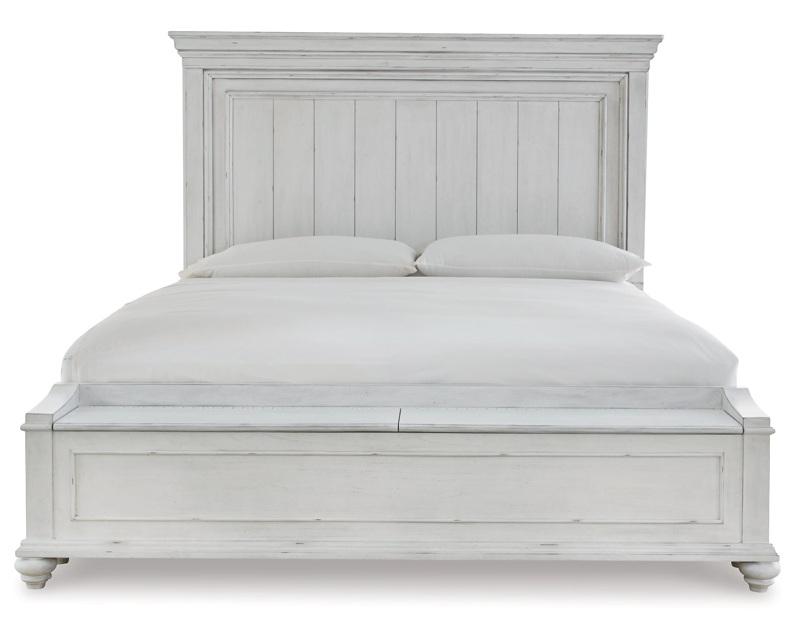 | Details | Includes queen panel headboard, storage bench footboard and rails, Made with solid wood, veneers and engineered wood, Distressed whitewash finish, Foundation/box spring required, sold separately, Mattress available, sold separately, Assembly required | |