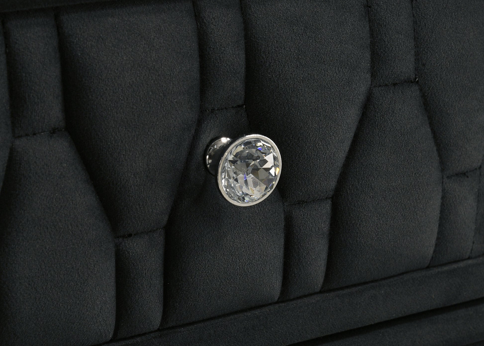 Unite form and function in this bedroom set, where sculpted glamour meets modern refinement. Each piece is wrapped in a black velvet with quilted textures, crystal knobs, and reflective acrylic accents. The dresser features a clear tempered glass top and LED case lighting without the fireplace insert. Combined with the LED wingback bed, USB nightstand, and tri-panel mirror, the set delivers soft sophistication with everyday practicality.