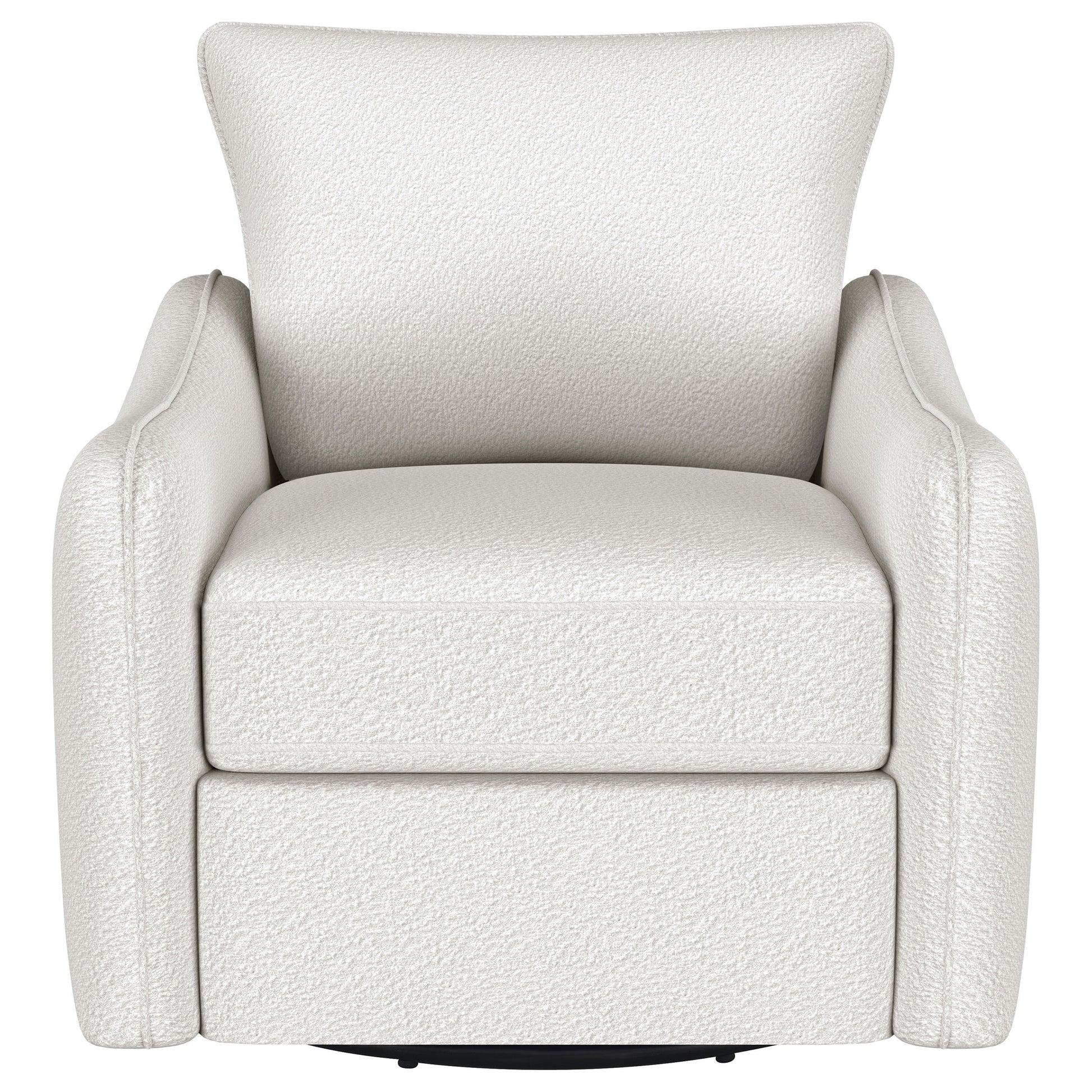 Nestled within the soft embrace of this bouclé upholstered chair, one finds a moment of tranquility. Its harmonious 360 swivel and glider functionality make each movement a fluid dance, a gentle invitation to unwind. The meticulously shaped arms, a testament to refined style, offer a restful perch for weary elbows. As the day's light fades, this chair becomes a cherished haven, its silhouette a blend of comfort and contemporary charm. In this cozy nook, time slows, and serenity takes a seat.
