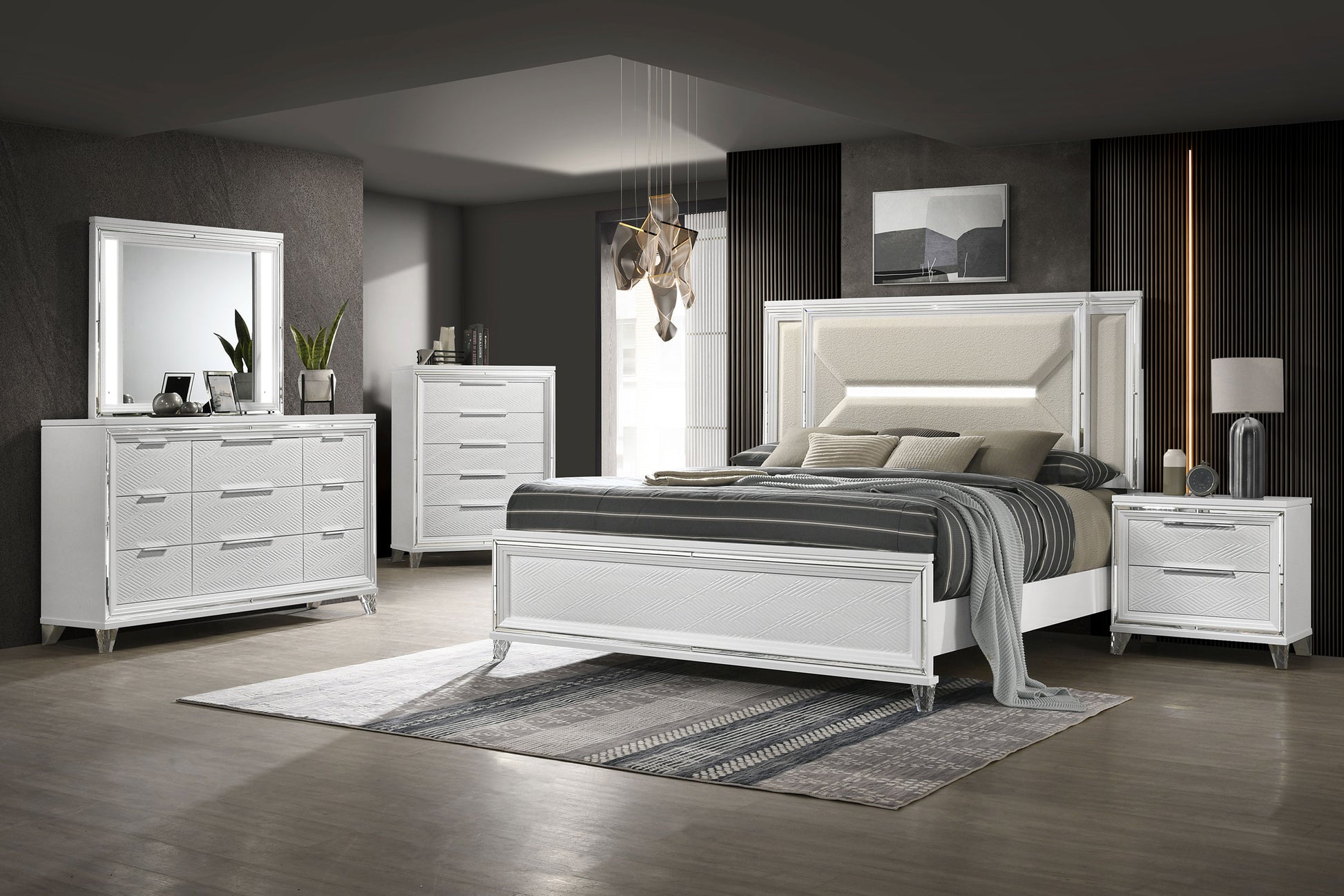Create a cohesive and luxurious look in your bedroom with this bedroom set. Featuring a bed, nightstand, dresser, mirror, and optional chest, each piece is designed with a modern Italian aesthetic. The white finish, picture framed recessed panels, and embossed herringbone graphic patterns exude sophistication, while the mirror framing, acrylic legs, and polished chrome metal hardware add a touch of opulence. This set offers both style and functionality, making it the perfect choice for your elegant bedroom.