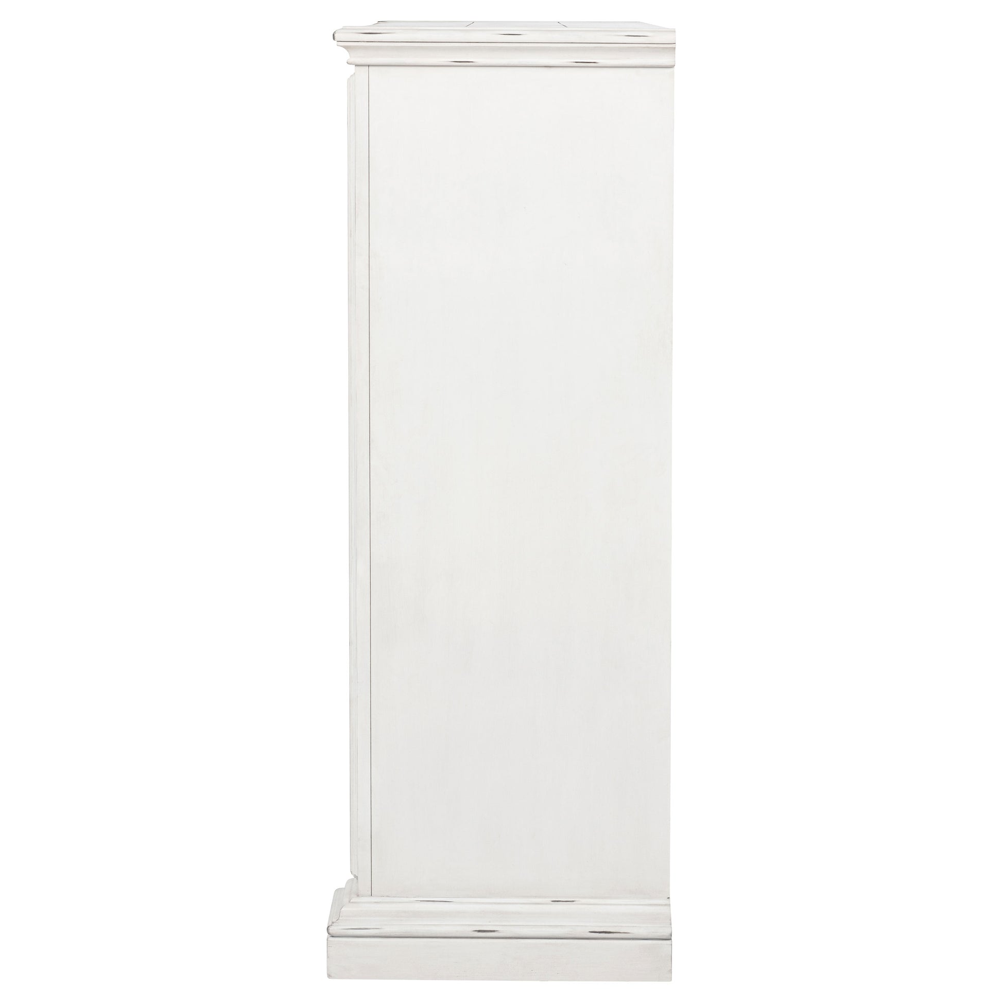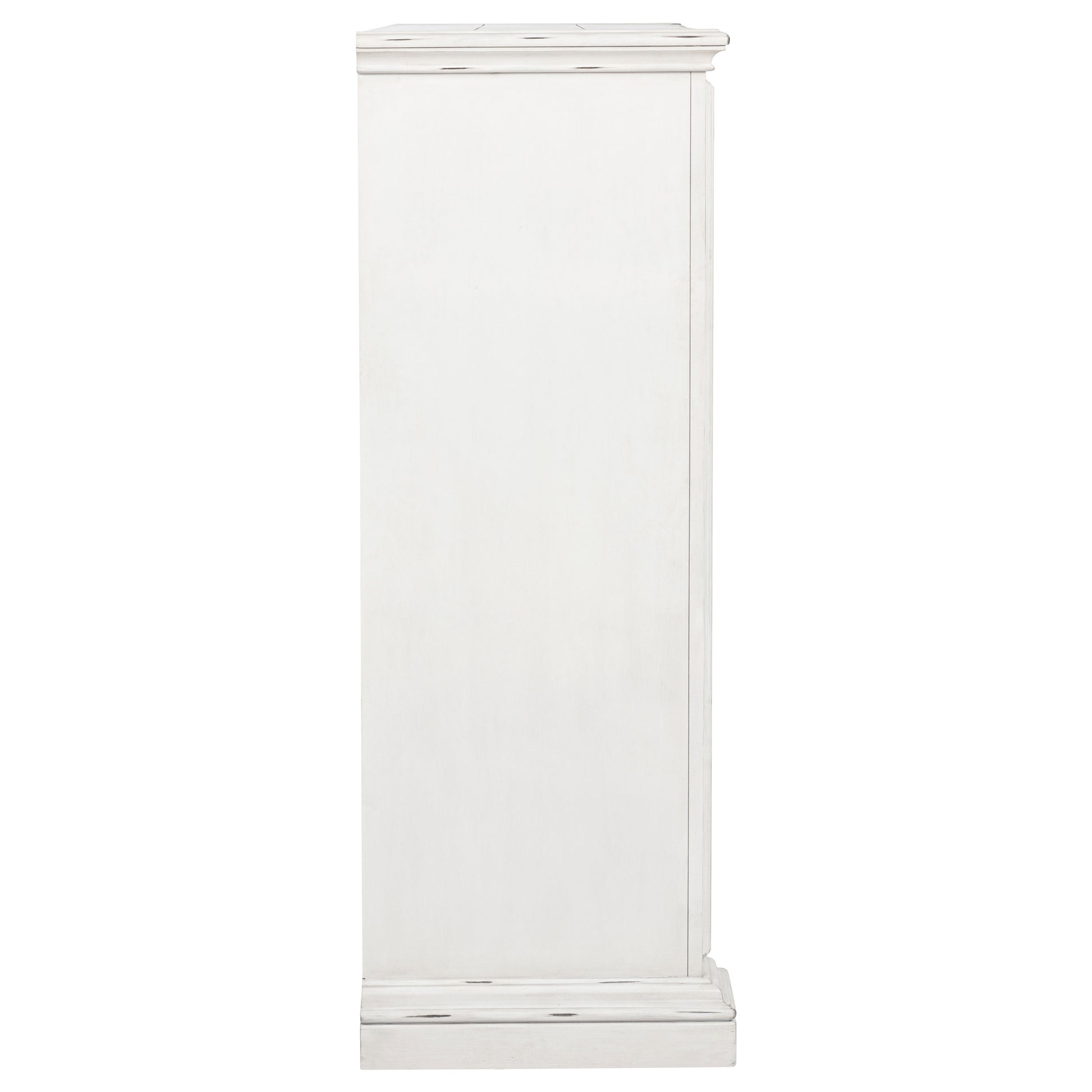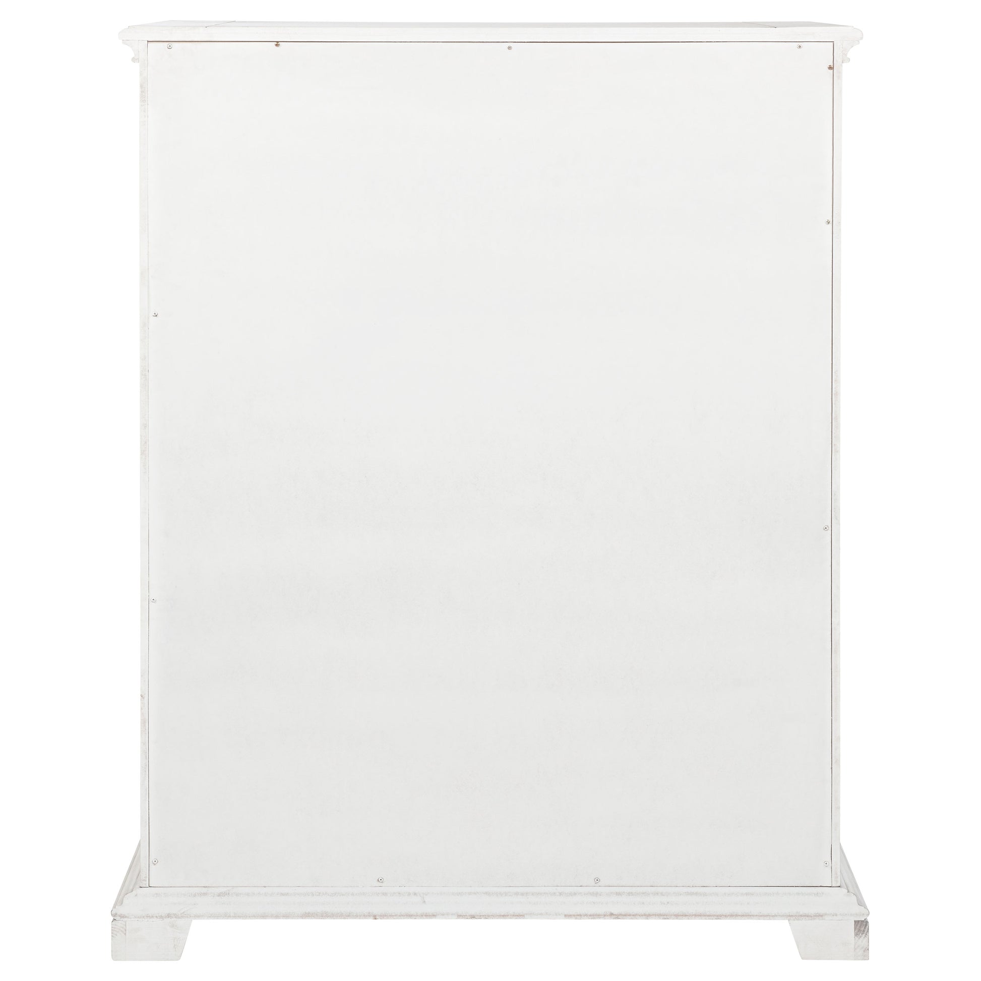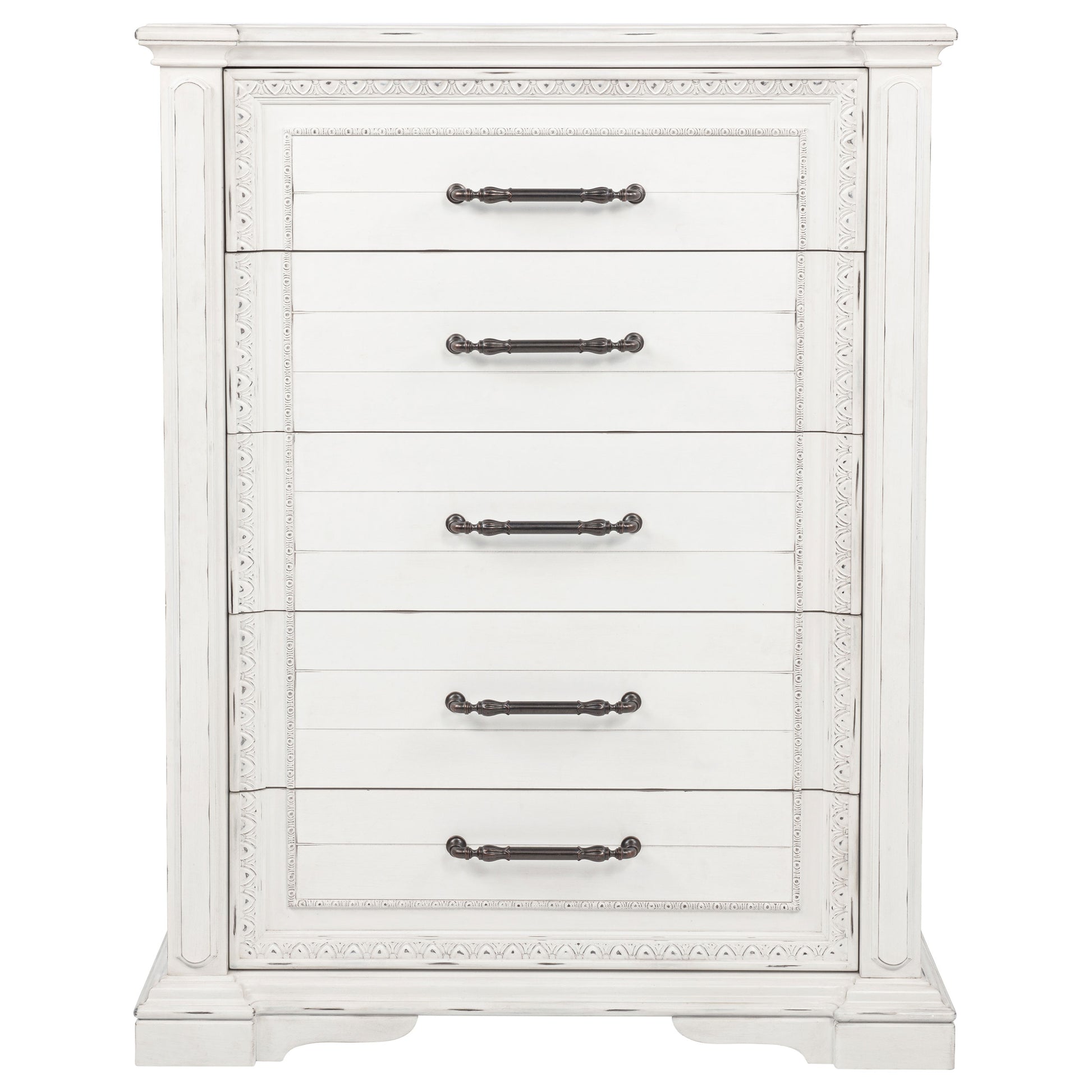Timeless in spirit and refined in detail, this five-drawer chest evokes quiet charm and lasting beauty. A vintage white finish softens its stately frame, while molded edges and antique bronze ring pulls add character and depth. Designed with thoughtful craftsmanship, it offers spacious storage and smooth functionality. Built from poplar, engineered wood, and veneer, it brings elegance and purpose to the bedroom.