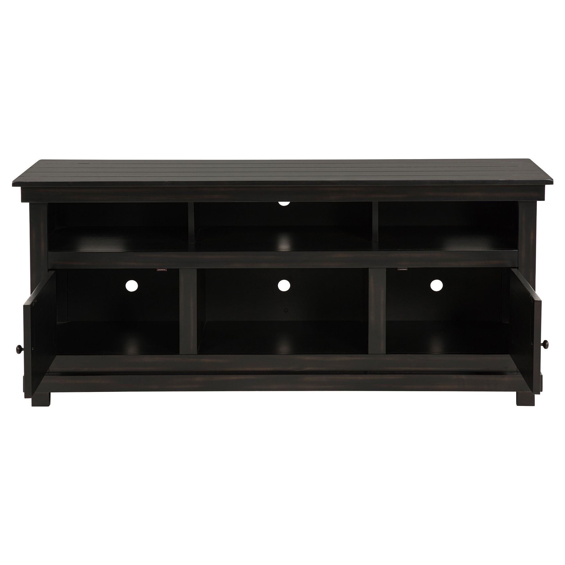 Complete a media center in your inviting home with a modern farmhouse TV stand. It's an approachable design with roughhewn wood details that create texture and dimensionality in your living space. Two shelves and six compartments create ample storage, perfect for everything from peripherals and accessories to personal decor. The media console features a clean-lined silhouette with a slim profile, perfect for a flat panel or wall-mounted television. This TV stand accommodates televisions up to 65 inches.