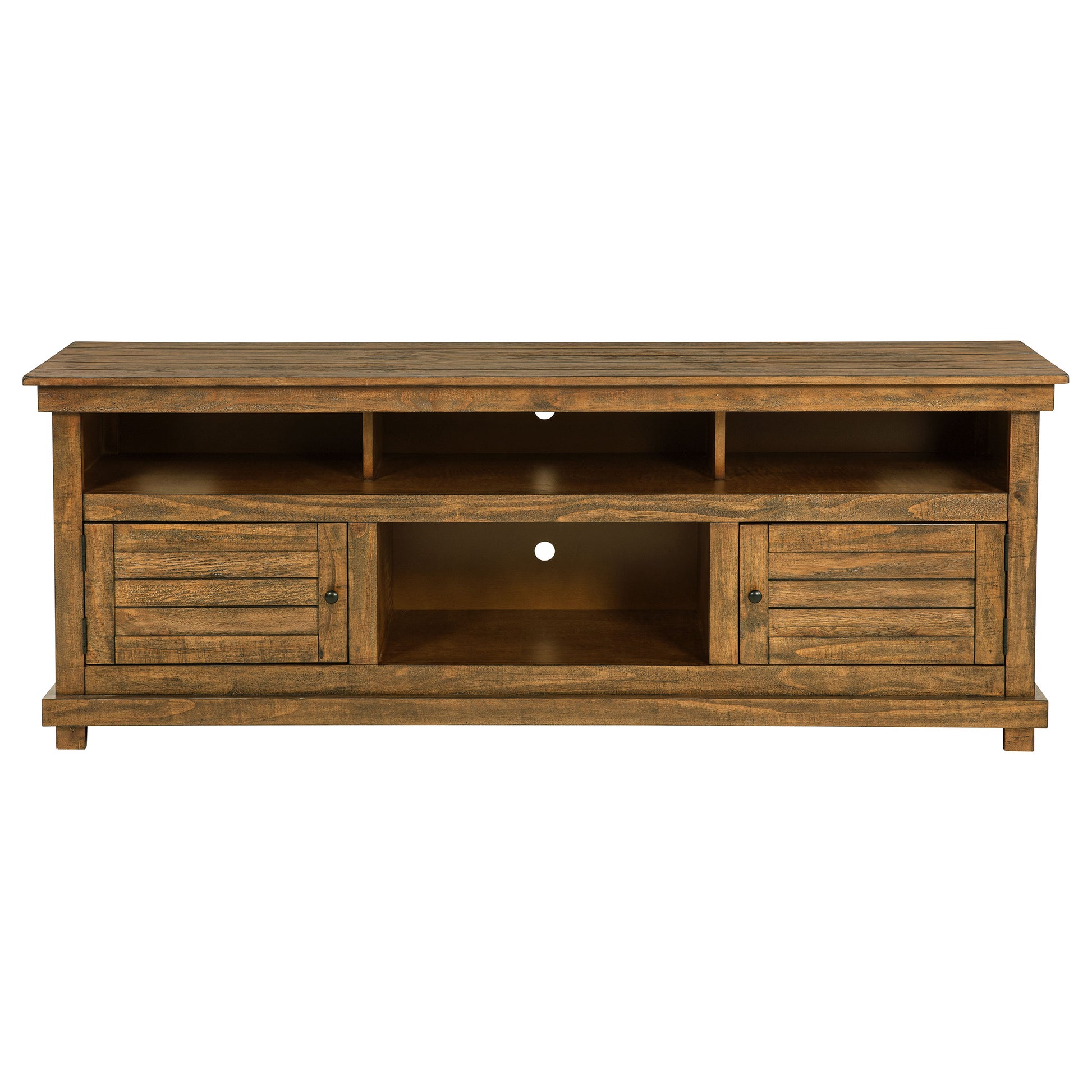 Introduce expansive storage underneath your flat panel television with this modern farmhouse TV stand. It's a wooden design with roughhewn details that offer charming texture and casual allure in your living room or den. Two cabinets offer decorative doors while providing plenty of interior storage that helps to create a tidy look in your living room. Two open shelves create space for media and gaming components mixed with decor that offers a personalized touch. Cord management openings complete the design, making for a streamlined design that accommodates televisions up to 75 inches placed on top or mounted above.