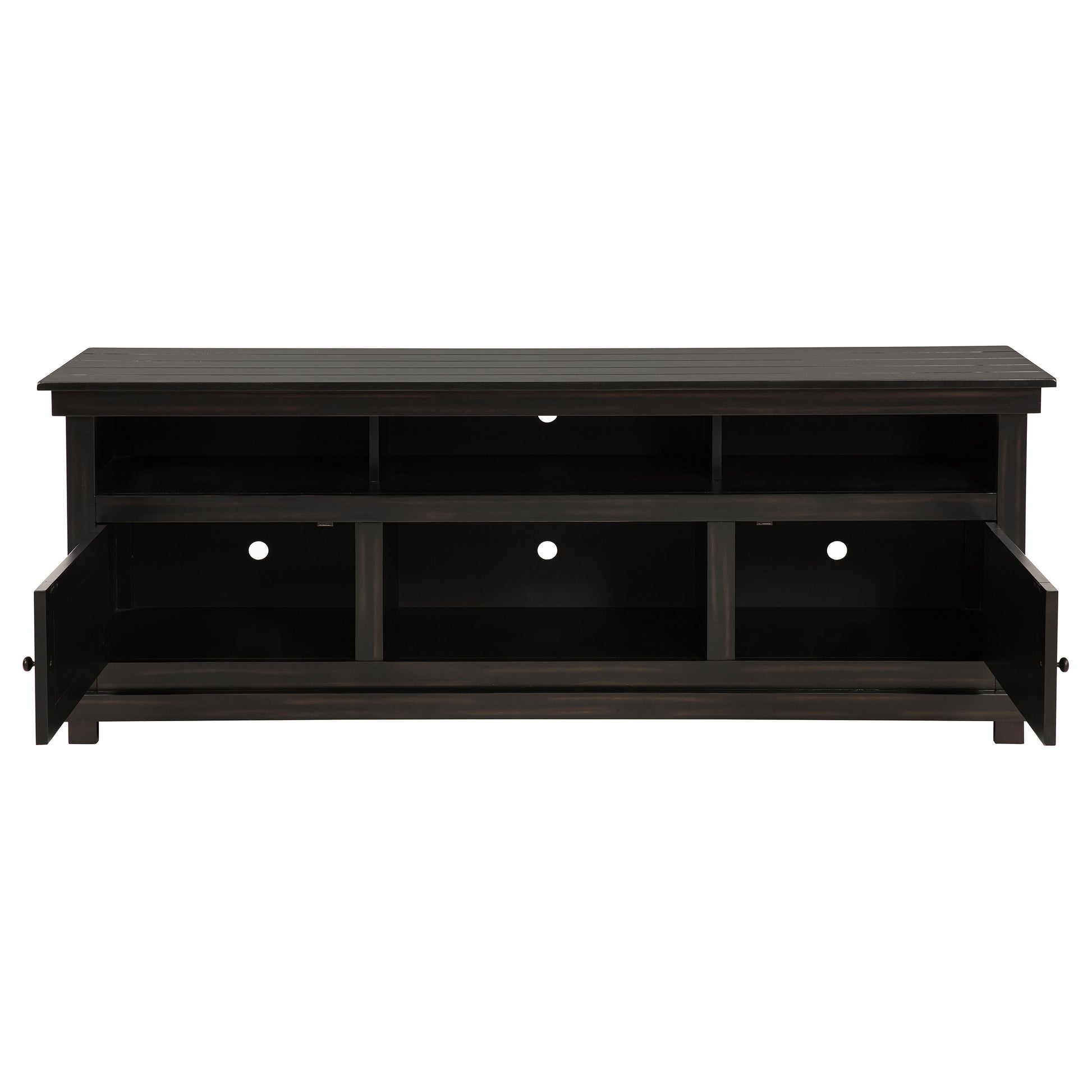 Introduce expansive storage underneath your flat panel television with this modern farmhouse TV stand. It's a wooden design with roughhewn details that offer charming texture and casual allure in your living room or den. Two cabinets offer decorative doors while providing plenty of interior storage that helps to create a tidy look in your living room. Two open shelves create space for media and gaming components mixed with decor that offers a personalized touch. Cord management openings complete the design, making for a streamlined design that accommodates televisions up to 75 inches placed on top or mounted above.