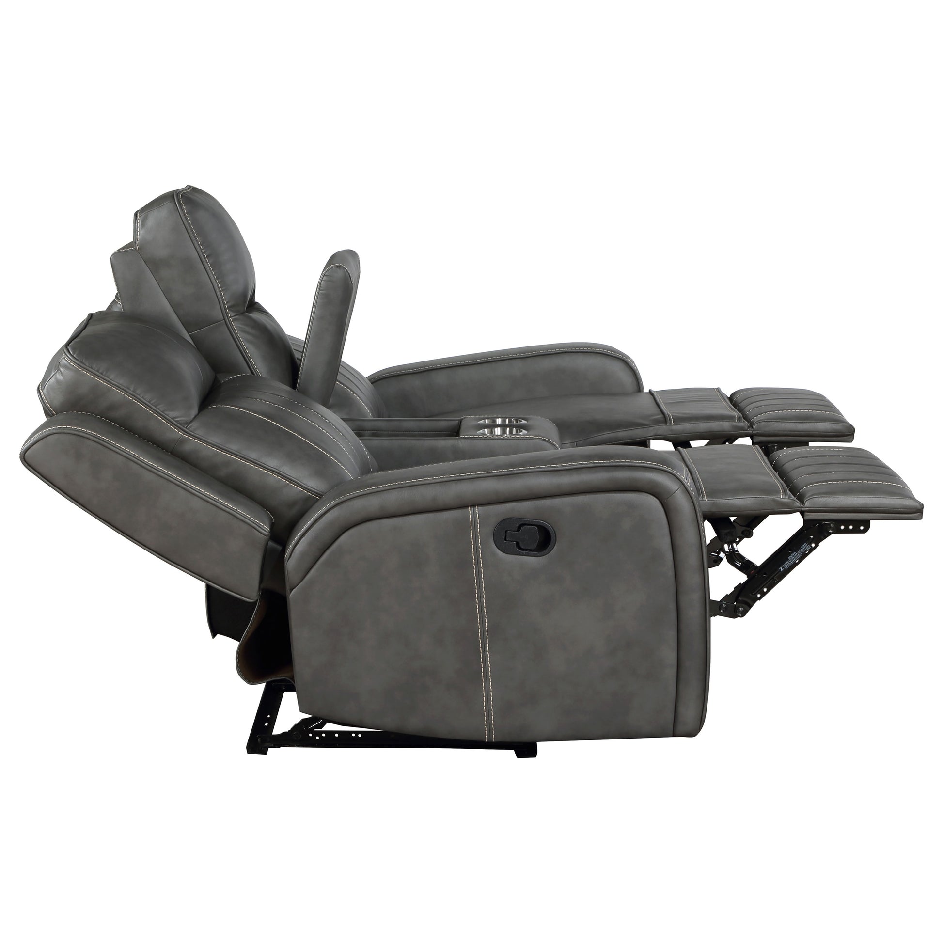 Relax in style with this transitional motion sofa set that blends modern and contemporary design. Each piece is upholstered in smooth grey leatherette with vertical topstitching for decorative detail and added dimension. Plush foam padding and pocket coil seating provide long-lasting support, while ultra-padded headrests enhance comfort. Manual reclining seats with a wall-hugger design maximize space efficiency. For added functionality, the loveseat includes a center storage console with dual cup holders.
