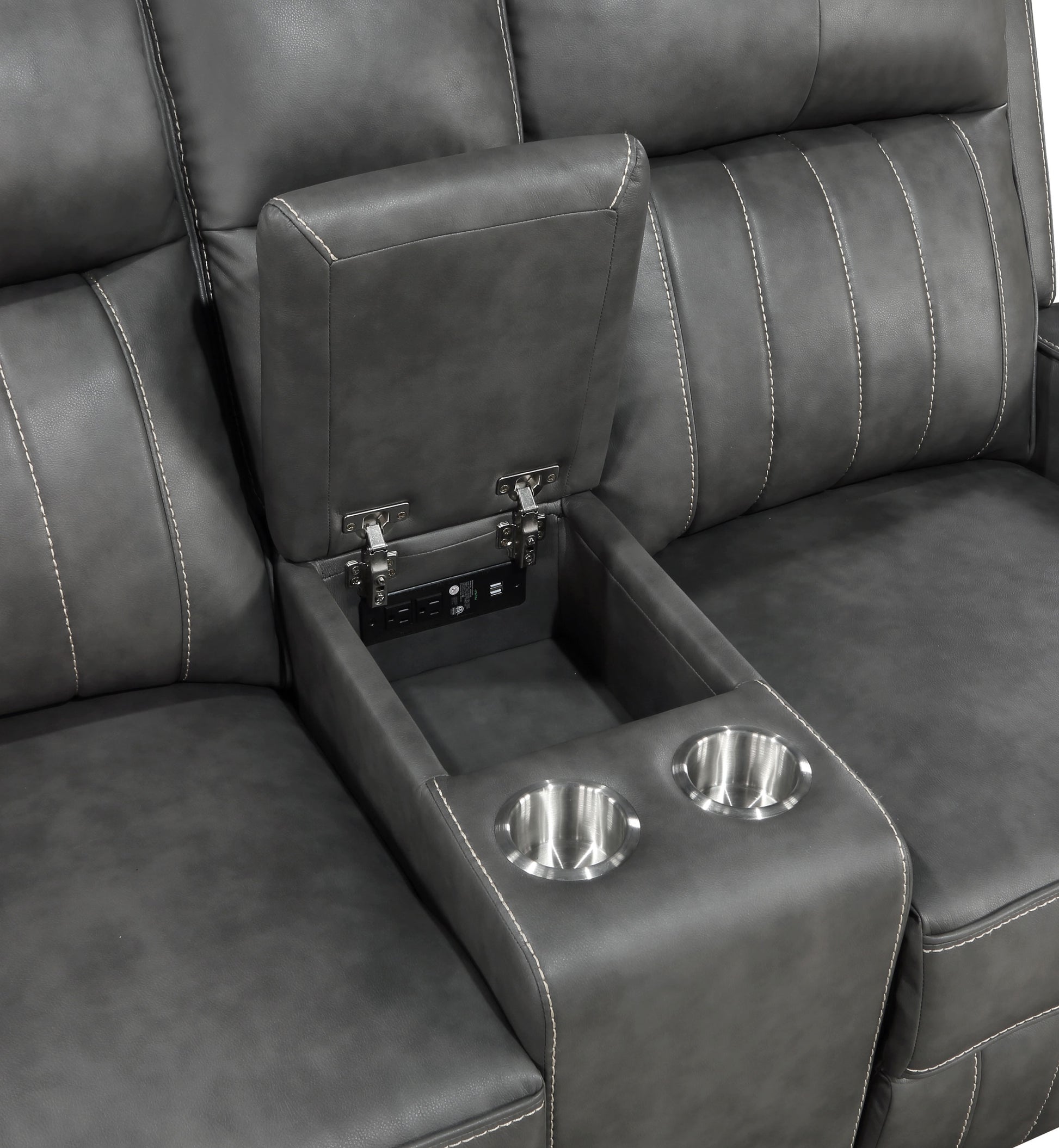 • Loveseat includes a flip-top storage console and two built-in metal cup holders