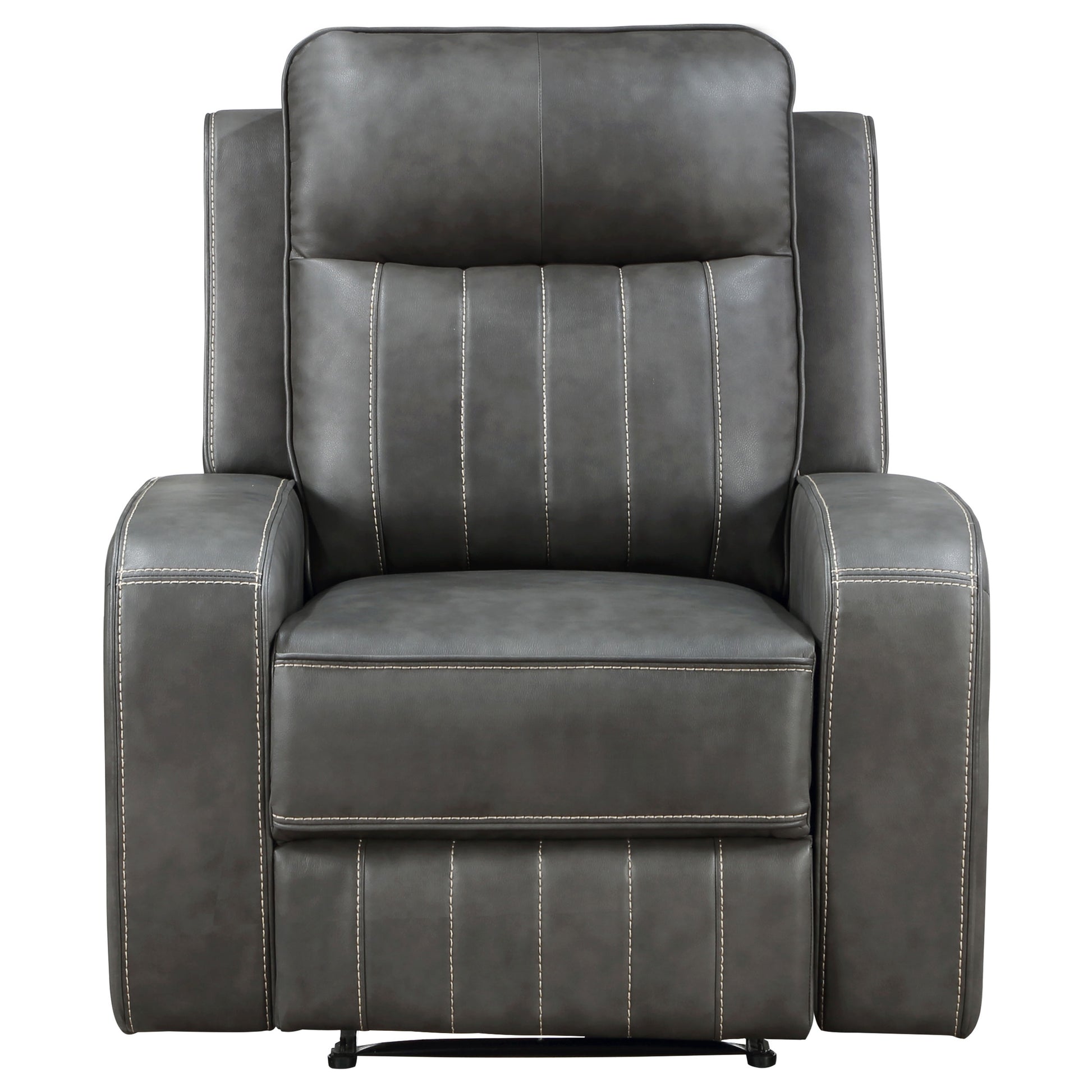 • Recliner upholstered in smooth grey leatherette with vertical topstitch accents