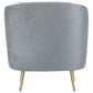 Inspired by a glam version of mid-century artistry, this three-piece sofa set offers all that’s needed to begin a romantic living space motif. Give a living room or family room its best design life with this set built with frames fully encased in solid wood and covered in decadent gray velvet. Vertical channeling on back interiors highlights the iconic kidney shape of its sofa and loveseat and add dimensionality to an extra comfy accent chair. Set atop slender, tapered legs fashioned of gold finish stainless steel, each piece reflects the parlor look of upscale retro furnishings. Set includes one sofa, one loveseat, and one chair.